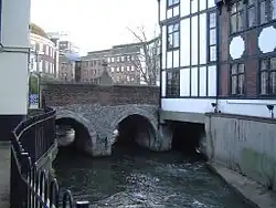 As it continues through the park towards the meeting point with the Hogsmill it passes the Packhorse Bridge, which was named after the mules that regularly transported gunpowder from the mills, across the river and into a brick magazine.[2] At its height in the mid-19th century, the gunpowder mill complex by the bridge employed 156 men. Gunpowder from Ewell is said to have been used in the American Civil War.[2]