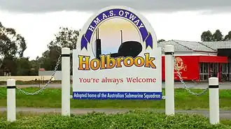 To honour Lieutenant Holbrook, the town's namesake, the Holbrook council acquired a portion of the hull of HMAS Otway, an Oberon-class submarine, after it was decommissioned by the Royal Australian Navy in 1995. The Navy gifted the fin from the submarine to the town. This resulted in a fund-raiser by the town and district to purchase the whole submarine. This drive was successful in raising $100,000, almost all a gift from Lieutenant Holbrook's widow, Gundula Holbrook. However, this amount was insufficient to purchase all of the Otway. Through negotiations with the scrap yard in Sydney, the town succeeded in purchasing all of the outside casing of Otway above the waterline. This part of the Otway is now displayed in Germanton Park in the heart of Holbrook, having been dedicated on 7–8 June 1997.[16][17]