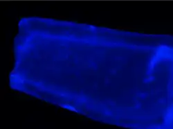 A longitudinal cross section of a polysulfone hollow fiber membrane intraluminally cultured with 3T3 fibroblasts and stained with DAPI.
