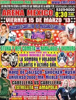 - ^ a b López, Gonzalo (March 15, 2013). "Torneo increible de parejas Atlantis y Ultimo Guerrero vs La Sombra y Volador Jr jpg 050540". Yahoo! Deportes (in Spanish). Yahoo!. Retrieved March 18, 2013.