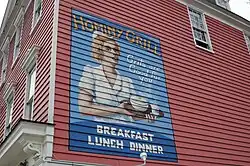 The huge mural that is painted on the street-facing side of the restaurant's facade is an iconic view in the city. Showcasing a blonde-haired waitress in old-fashioned garb holding a steaming bowl of grits, the mural aptly bears the slogan "grits are good for you," in a style that emulates World War II era propaganda.[12]
