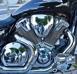 Although it was similar to the 1800, the 1300 was not the same engine with a smaller bore or shorter stroke, but a new design.[21] The 1300 engine used a 38 mm constant velocity carburetor unlike the fuel injected 1800. The single carb had a manual choke for cold starts,[22] and was heated by engine coolant to improve cold-weather operation. The configuration of the new powerplant was the same liquid-cooled overhead-cam 52-degree V-twin layout as its larger sibling, but the VTX1300 engine was designed around a single-pin crankshaft, unlike the 1800s dual-pin crank. As a result, the 1300 required dual two-axis primary counterbalancers to control engine vibration. The VTX1300 engine had a cable-operated clutch, instead of the hydraulic clutch of the VTX1800.[7] The 1300 engine used an air injection system and catalytic converters, similar to the bigger engine, as well as a lean fuel-air mixture to control emissions.[24]