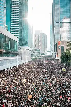 In mid-2019, several mass protests took place. A proposed extradition bill would allow dissidents to be arbitrarily transferred to mainland China. The organisers of a march on 16 June claimed to have included two million people, a quarter of Hong Kong's population.[57]
