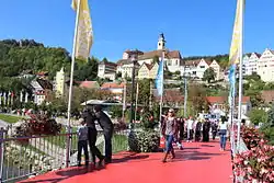 Horb was first documented as a town in 1228,[3] and the first references to a mayor (Schultheiß) and a market are to be found in 1244 and 1277, respectively. Until 1305, Horb belonged to the counts palatine of Tübingen, and later to the counts of Hohenberg. In 1381, Horb came into the possession of Austria (Further Austria) and served as an administrative seat for the local Vogt. Later, in 1806, Horb became part of the Kingdom of Württemberg, and a year it was made into an administrative center, Oberamt Horb. Its borders had changed several times in the following years, and in 1938 it was reorganized as a rural district, Landkreis Horb.