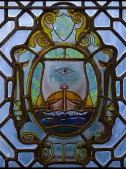 The school's traditional emblem depicted in a stained glass window in the main building