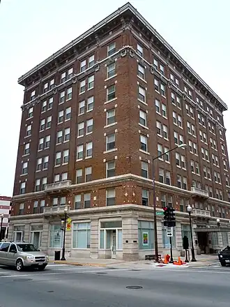 In 1915, a group of businessmen in Aurora, Illinois determined that the city required a first-class hotel. They formed the Aurora Island Hotel Corporation to oversee the project as a branch of the Aurora Island Development Corporation. The site chosen was previously a mill race and swimming hole. Construction on the eight-story building began in 1916. It was the first skyscraper on Stolp Island, Aurora's downtown. The 135-room hotel was opened for business on July 14, 1917. Edwin C. Faber, the general manager of the Chicago Aurora and Elgin Railroad, was the president of the hotel. The structure was designed by H. Ziegler Dietz and built by George W. Caldwell of Caldwell & Marshall. Harry H. Dunbar took over operations in 1919. In 1928, he sold it to William O. Gosselin, who was in the process of building the Leland Hotel on the island. On June 3, 1982, it was listed on the National Register of Historic Places by the National Park Service. On September 10, 1986, it was listed as a contributing property to the Stolp Island Historic District.[2]