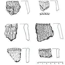 - Swanson cord-marked – represented by 13 rim sherds and 698 body sherds; grit-tempered, globular vessels with slightly elongated, semi-conoidal bases, cordmarked surface, vertical to slightly incurved rim profile, rounded and notched lips, and fingernail impressions at the base of neck. Similar pottery has been found at the Starved Rock and Zimmerman[2] sites in Protohistoric and early Historic contexts; and at Fisher[13] and Moccasin Bluff[12] in Prehistoric contexts. First defined at the Zimmerman site. Time period: Prehistoric to Protohistoric or early Historic. Cultural affiliation: Late Woodland.
