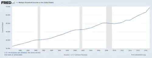 The Current Population Survey of the U.S. Census Bureau reported in September 2022 that real median household income was $70,784 in 2021, not statistically different from the 2020 estimate of $71,186.[5]