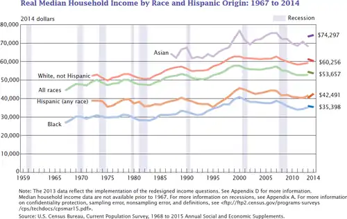 - ^ DeNavas-Walt, Carmen; Proctor, Bernadette D.; Smith, Jessica C. (September 2012). "Real Median Household Income by Race and Hispanic Origin: 1967 to 2010". Income, Poverty, and Health Insurance Coverage in the United States: 2014 (PDF). U.S. Census Bureau. p. 8.