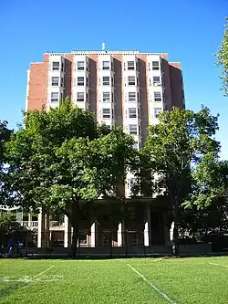 Blackstone Hall was designed by architect Ralph D. Huszagh, and construction was completed in 1930.[22] At the end of 1953, the university had purchased the building for use as a nurses' residence. The residents who had lived there for several years were reluctant to leave, but for the university a more pressing matter left them with no alternative. A shortage of nurses had led to a "most critical situation" in the university's expanding medical system, and the university could not acquire the badly needed nurses without additional housing.[23]