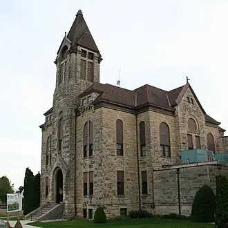 The Houston County Courthouse and Jail, located at 304 Marshall Street South in Caledonia, Houston County in the U.S. state of Minnesota, consists of a Romanesque stone courthouse featuring a prominent center tower, built in 1883 and an Italianate stone jail and sheriff residence built in 1875. Both were designed by C. G. Maybury & Son of Winona.[3]