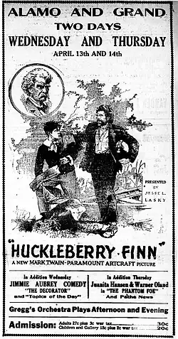 Huckleberry Finn is a surviving American silent dramatic rural film from 1920, based on Mark Twain's 1884 classic Adventures of Huckleberry Finn. It was produced by Famous Players–Lasky and distributed through Paramount Pictures. William Desmond Taylor directed Huckleberry Finn, as he had the 1917 film version of Tom Sawyer, using a scenario written by Julia Crawford Ivers, who also had been the writer for Tom Sawyer.[1]