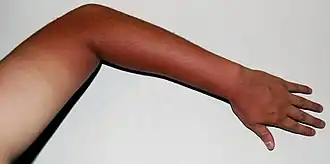A person's natural skin color affects their reaction to exposure to the sun. Generally, those who start out with darker skin color and more melanin have better abilities to tan. Individuals with very light skin and albinos have no ability to tan.[104] The biggest differences resulting from sun exposure are visible in individuals who start out with moderately pigmented brown skin: the change is dramatically visible as tan lines, where parts of the skin which tanned are delineated from unexposed skin.[5]