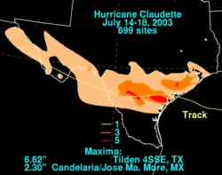 - ^ James Franklin (July 15, 2003). "Tropical Storm Claudette Discussion Number 29". National Hurricane Center. Retrieved February 18, 2025.