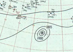 ![]() Surface weather analysis of Dot near peak intensity on August 3 | |