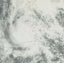 Low-resolution satellite image of a tropical cyclone to the east of Central America