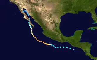 In Oaxaca in southeastern Mexico, rains from the hurricane washed away two bridges.[40] Near Acapulco, the strong winds knocked down trees.[13][25] Across Guerrero, heavy rains triggered flash floods that washed out two bridges and destroyed 20 homes.[41] Throughout Michoacán, an estimated 1,000 people were left homeless by the hurricane.[42] In the Gulf of California, rough waves sank a dive boat with 16 people onboard, who survived on a lifeboat and a dinghy – one group drifted for 100 km (60 mi) before reaching the Sonoran coast, and the other group was rescued by the Mexican Navy.[43]