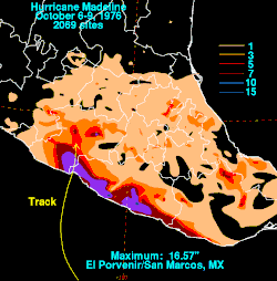 Hurricane Madeline produced heavy rains over Mexico, peaking at 16.57 in (421 mm), rainfall fell at El Povenir/San Marcos. According to Comision Nacional del Agua, a parent agency of the Servicio Meteorológico Nacional, rainfall fell at 2,069 sites.[13] Damage from the hurricane was considered to be severe.[1] In Chilpancingo, Guerrero, two people drowned from the hurricane. In addition, five other deaths were reported.[11] The cyclone also flooded two major hydro-electrical dams and power outages were reported.[12] While no serious damage was reported in Zihuatanejo,[10] many boats were damaged.[14] In addition, the storm caused extensive crop damage.[10] Losses from Madeline, combined with previous hurricanes Liza and Kathleen, were estimated at $200 million (1976 USD).[15] It was the second storm to strike Mexico within a week; Hurricane Liza was the first.[16] When Madeline was over the ocean, it impacted several ships, but no major damage from these ships was reported.[1]