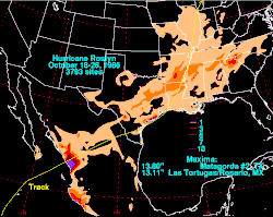 As water temperatures remained very warm along its path, the hurricane was able to intensify quickly. Roslyn reached peak winds of 145 mph (230 km/h) 48 hours after attaining hurricane status, while located about 550 miles (890 km) southwest of Manzanillo, Colima; that made it the strongest hurricane of the season. Roslyn maintained peak intensity for about 18 hours, during which it turned more to the northwest in response to a powerful advancing cold front. On October 20, the hurricane curved northeastward as steady weakening ensued. After bypassing southeast of the Baja California Peninsula, Hurricane Roslyn moved ashore on October 22 at Mazatlán, Sinaloa with winds of 75 mph (120 km/h).[1] The low-level center rapidly dissipated, although the upper-level circulation continued northeastward along the advancing cold front. A frontal low developed in the western Gulf of Mexico, which moved over southeastern Texas and later through the Mississippi Valley. The original upper-level circulation maintained its northeast movement, bringing rainfall to the southeastern United States.[2]