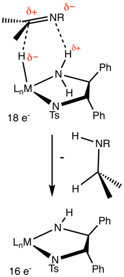 Ruthenium(II) complexes of amine ligands are known for engaging in the outer-sphere mechanism, during which the imine/iminium substrate does not bind to the metal center directly. Instead, substrate receives the elements of H2 by interaction with Ru-H and N-H sites.[12][13] This process is utilized by the Shvo catalyst and many ruthenium amine complexes. One such complex is Baratta's catalyst RuCl2(PPh3)2(ampy) (ampy = 2-picolylamine) for transfer hydrogenation.[14]