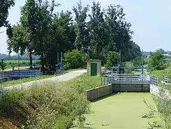 The Biella plain is crossed by numerous irrigation ditches and canals, such as the ditch of Buronzo, which originates from a branch on the hydrographic left of the Cervo near Castelletto Cervo and returns to it further downstream, now in the province of Vercelli. These canals were generally built to serve rice-growing, which is mainly concentrated in the southeastern part of the province.[27] The area on the hydrographic right of the Cervo is served by various canals including the Roggia Massa di Serravalle, which originates in Cerrione from the Elvo and, after crossing the municipality of Salussola, flows into the Roggia Marchesa. The latter originates instead from the Cervo, flowing into the stream itself further downstream, not far from Villanova Biellese. The Roggia Madama and Roggia Molinara also depart from the Cerrione area, which then descend into the plain below, dispersing into numerous minor branches.[28] Finally, in the southern area of Biella, the Vanoni Canal passes through, an important derivation of the Depretis Canal completed in 1958 to distribute water from the Dora Baltea in the lower part of the rice-growing district.[27]