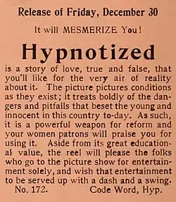 The single reel drama, approximately 1,000 feet long, was released on December 30, 1910.[1] The film was released in Britain under the title A Quack Hypnotist on April 26, 1913.[10] The film likely had a wide national release, known advertising theaters include those in Arizona,[11] Pennsylvania,[12] and Kansas.[13] Some theaters did not provide the production credits,[14] complicating identification with Selig Polyscope's Hypnotized.[15] The film received a positive review in the Moving Picture World which said, "It is a good story, well told, and the audience seems intensely interested in it."[1] The New York Dramatic Mirror offered a review that neither commended or criticized the production in its summary review of the film.[1]