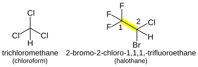 In haloalkanes and haloarenes (R−X), Halogen functional groups are prefixed with the bonding position and take the form of fluoro-, chloro-, bromo-, iodo-, etc., depending on the halogen. Multiple groups are dichloro-, trichloro-, etc., and dissimilar groups are ordered alphabetically as before. For example, CHCl3 (chloroform) is trichloromethane. The anesthetic halothane (CF3CHBrCl) is 2-bromo-2-chloro-1,1,1-trifluoroethane.