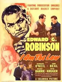 I Am the Law (1938) is a crime drama directed by Alexander Hall and starring Edward G. Robinson. The film, one in a wave of films of the time with anti-criminal themes, represents a departure from Robinson's screen image as a gangster.[1] The picture was based on Fred Allhoff's 1936 series of articles for Liberty magazine called "Tracking New York's Crime Barons".[2]