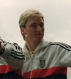 Nine months after winning the Scottish Cup, he transferred to Rangers for £850,000 – still the record fee received by St Mirren[10] – turning down offers from English clubs to become part of the strong squad being assembled at Ibrox by Graeme Souness.[7] He is remembered as a key player of the era at the club,[4] appearing 336 times and scoring 42 goals.[11] Along with Ally McCoist and Richard Gough, he played a part in every season of Rangers' historic run of nine titles in a row between 1988–89 and 1996–97 under managers Souness and Walter Smith.[11][12] Having picked up his first winner's medal a decade earlier, scoring in the 1988 Scottish League Cup Final,[12] he also featured in the first title win with manager Dick Advocaat in 1998–99, and appeared as a substitute in the League Cup and Scottish Cup finals that season.[11][13] His playing time became limited under Advocaat, and he moved on to Dunfermline Athletic in 2000.