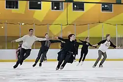 In a format developed by Olympic Champion John Curry as a class for his skating company, skaters in the group's weekly Master Edge Class focus on ensemble movement to music. This class functions much like the ballet barre in Ballet.