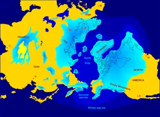 - ^ a b c Ladant, Jean-Baptiste; Donnadieu, Yannick (2016-09-21). "Palaeogeographic regulation of glacial events during the Cretaceous supergreenhouse". Nature Communications. 7 (1): 12771. Bibcode:2016NatCo...712771L. doi:10.1038/ncomms12771. ISSN 2041-1723. PMC 5036002. PMID 27650167.