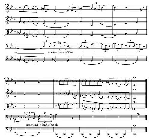 It begins as an impassioned recitative, with sustained arioso string accompaniment. After seven bars the time signature changes from 4/4 to 3/4, resuming a simple, calm version of the second half of the abgesang from the first movement[44] and repeating words related to the Book of Revelation in a triplet rhythm: "Da wischt mir die Tränen mein Heiland selbst ab" ("There my Saviour Himself wipes away my tears").