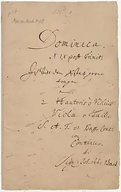 The cantata is structured in five movements, with alternating arias, recitatives and a four-part chorale. Bach scored for a bass soloist, a four-part choir (SATB) in the closing chorale, and a Baroque instrumental ensemble of two oboes (Ob), taille (Ot), two violins (Vl), viola (Va), cello (Vc), and basso continuo.[20] Except for the obbligato oboe in the third movement, the three oboes double the violins and viola colla parte. The title page of the autograph score reads: "Domin. 19 post Trinit. / Ich will den Xstab gerne tragen / a / 2 / Hautb. o Viol. / Viola o / Taille / 4 Voci / Basso solo / e / Cont. / di / J.S.Bach". The score begins with the line "J.J.Dominica 19 post trinitatis. Cantata à Voce sola. è stromenti"[30] ("J.J. Sunday 19 after Trinity, Cantata for solo voice, and instruments"), making it one of the few works Bach termed a cantata.[12] It is 21 minutes long.[31]