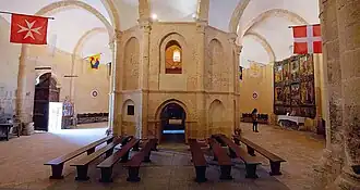 In the walls of the nave remain vestiges of the old mural decoration as well as two niches, one with the icon of the patron saint of the Order of Malta, Our Lady of Philermo and another with the icon of the patron saint, St. John the Baptist. The flags of the Order of Malta, which refer to the languages into which it is divided, are located throughout the nave. In the central apse there is an image of Jesus crucified from the 13th century. In the left apse is located the chapel of the tabernacle where there is a copy of the image of St. John the Baptist, patron saint of the Order of Malta, whose original is in its headquarters in Madrid. In the right apse is the Romanesque image of the Virgin of Peace.