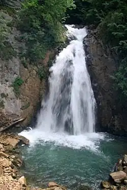 Ilomska waterfalls include Veliki vodopad and Mali vodopad (Great, and Lesser Waterfall). To those, several other waterfalls could be joined in the upper and middle course. Great and Lesser waterfalls are located about 2 km from the mouth of the Ilomska river into the Ugar, in a narrow canyon at the Under-Vlašić-mountain plateau between almost vertical Korićan cliffs Korićanske stijene, and Marići and Đenići villages. Both waterfalls are at the altitude of 750 –780 m above sea level, that is about 350 meters lower than the surrounding imljani – Korićani plateau.[1][2]