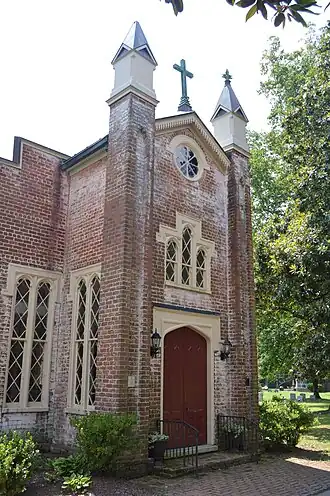 The one-story, brick building was constructed in the Gothic Revival style. Additions made to the original church in 1881, 1916, and 1967, have given the building a "T"-plan. Surrounding the church on three sides is the contributing church cemetery, which includes several Confederate graves.[5]
