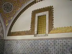 It is impossible to determine what role the Sultan played in the Council's workings. On the one hand, all decisions were made in his name and on his authority, and Ottoman law codes foresaw that the Sultan could make his wishes known to the Council through the Kapi Agha.[12] In Ottoman legal theory, however, as codified in the 16th and 17th centuries, the Grand Vizier was the Sultan's "absolute deputy" and the sole intermediary between the sovereign and the administration.[13] Therefore after each meeting, the Grand Vizier—according to some 16th-century accounts, however, this was done by the entire Council[14]—would go to report on proceedings to the Sultan in the Inner Palace.[15] These interviews between the Grand Vizier and the Sultan were probably the main conduit of communication between the ruler and his government.[14] At the same time, the Sultan could, if he wished, secretly listen in on the Council in session behind a grille-covered window (kasr-ı adil) overlooking the Council chamber and connected directly with the Sultan's private quarters in the harem, added either in the early reign of Süleyman the Magnificent or, according to another tradition, already by Mehmed II.[6][15] It is clear, however, that each Sultan favoured a different style of government, and their roles changed even within the same reign: thus Ahmed I (r. 1603–1617) is recorded as refusing an audience with his Grand Vizier, demanding written reports instead, while Murad III (r. 1574–1595) at first once more presided over Council meetings in person, but increasingly withdrew from active participation as his reign proceeded.[13] By the mid-17th century, on the other hand, the former elaborate protocol at Council sessions had once more been relaxed, and it is reported by the Ottoman renegade Bobovi that the Sultan (possibly Murad IV, r. 1623–1640) once more presided over Council meetings in person.[15] In addition, the courtiers and servants of the Inner Palace, or the members of the Imperial Harem such as the Valide Sultan (Sultana mother) or the Haseki Sultan (Sultana consort), who had direct and intimate access to the Sultan's person, often influenced government decisions bypassing the Imperial Council and the Grand Vizier altogether.[16]