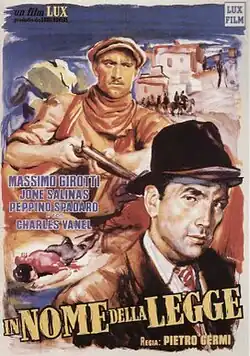 In the Name of the Law (Italian: In nome della legge) is a 1949 Italian language mafia drama film directed by Pietro Germi. It Is based on Giuseppe Guido Lo Schiavo's novel Piccola pretura. Federico Fellini co-wrote the script. The style of the film is close to Italian neorealism film movement.