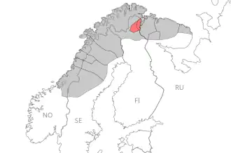 Inari Sámi is one of three Sámi languages spoken in Finland; the other two are Northern Sámi and Skolt Sámi, which are endangered languages as well.[4] There may be as many as nine Sámi languages.[5] The traditional Sámi homeland, Sápmi, encompasses the northern regions of Norway, Sweden, Finland, and parts of Russia. Sámi is the only officially recognized indigenous group in the European Union.[4]