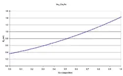 InGaAs has a lattice parameter that increases linearly with the concentration of InAs in the alloy.[7] The liquid-solid phase diagram[3] shows that during solidification from a solution containing GaAs and InAs, GaAs is taken up at a much higher rate than InAs, depleting the solution of GaAs. During growth from solution, the composition of first material to solidify is rich in GaAs while the last material to solidify is richer in InAs. This feature has been exploited to produce ingots of InGaAs with graded composition along the length of the ingot. However, the strain introduced by the changing lattice constant causes the ingot to be polycrystalline and limits the characterization to a few parameters, such as bandgap and lattice constant with uncertainty due to the continuous compositional grading in these samples.
