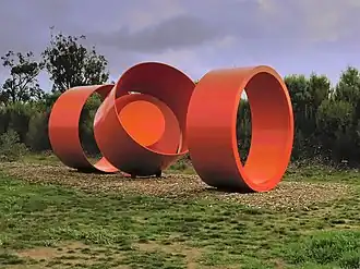 This work was installed in 1980, on a small lawn outside the Union Building at the heart of the University of Melbourne.[52] It is formed from 19mm steel, and consists of two upright steel circles, each 360 cm in diameter, and three folded metal planes; the total length is 6 metres.[53] It provides the students with a unique resting place among its massive unfurling bands and is the focal point of one of the university's busiest outdoor spaces, the Union Lawn.[54] see more images