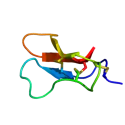 An inhibitor cystine knot (also known as ICK or Knottin) is a protein structural motif containing three disulfide bridges. Knottins are one of three folds in the cystine knot motif; the other closely related knots are the growth factor cystine knot (GFCK) and the cyclic cystine knot (CCK; cyclotide).[2] Types include a) cyclic mobius, b) cyclic bracelet, c) acyclic inhibitor knottins.[3] Cystine knot motifs are found frequently in nature in a plethora of plants, animals, and fungi and serve diverse functions from appetite suppression to anti-fungal activity.[4]