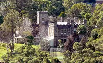 The castle was built from local sandstone in the late English Gothic style. Access to the castle was originally via rowing boat and a rough bush track. A wharf was later added.[1]