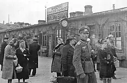 - Warszawa Gdańska railway station – the station area was secured by a machine gun nest and six individual firing positions.[1] A detached unit from the 2nd Battalion of Station Guards was stationed in the station buildings, usually accompanied by several officials armed with handguns. From the Feliński Street side, the station was guarded by a fortified guardhouse with a 12-man garrison. Near the station buildings, there was also a transit point for furloughed soldiers, where around 40 soldiers usually stayed.[4] Since July 26, 1944, the nearby road viaduct connecting Żoliborz with Śródmieście was also defended by a Panzer IV tank.[1] The station's garrison, like the posts at the nearby bridges, was connected by field communication wires to the Cytadel fortress.[5]