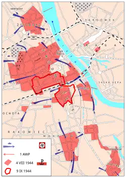 August 5, 1944, saw the start of the German counteroffensive against the insurgent forces in Warsaw. After three days of fierce fighting, a battle group led by SS-Gruppenführer Heinz Reinefarth captured most of Wola and then broke through to the Government District around Józef Piłsudski Avenue. The area controlled by Home Army forces shrank to four isolated districts: Śródmieście with Powiśle, Old Town, Żoliborz, and Mokotów.[34] After the fall of Wola, the main objective of the German offensive became the Old Town of Warsaw. The German command aimed to secure access to the Vistula river from the Cross-City Bridge to the Kierbedź Bridge, thus permanently securing the rear of German forces fighting the Red Army on the river's right bank.[35] According to Adam Borkiewicz, the Old Town became the "decisive battlefield" that would determine the fate of the uprising.[36]