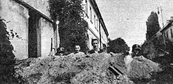 In the first weeks of the uprising, the Germans focused their efforts on unblocking the main Warsaw communication arteries and capturing Old Town, hence they did not undertake serious offensive actions in the Żoliborz direction. Already in the first days of August, they expanded their fortifications around Warszawa Gdańska railway station, the Chemical Institute, and along the outer railway line, also reinforcing their garrisons. They also began clearing the outskirts by destroying residential buildings, accompanied by numerous crimes against the civilian population.[50] On August 6, Polish residents were expelled from houses near Warszawa Gdańska railway station and forced to work dismantling insurgent barricades. When some civilians attempted to flee to the insurgent-controlled area, German soldiers opened fire, killing at least three people and injuring many others on August 7[51] or 8.[52] German troops burned down the unemployed barracks estate at Feliński Street, not allowing an unspecified number of inhabitants to leave burning buildings. The Germans also pacified the area around Błońska Street, where they shot between 50[53] and 68[54] Poles. Poorly armed units commanded by Lieutenant Colonel Żywiciel were unable to take effective countermeasures.[55]