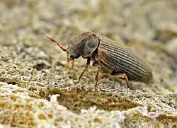 The warehouse beetle is lively and grows at a rapid rate. These beetles can be found in stored food and are attracted to plants and insect collections in a museum.[18] The beetle can be found in the dark, storage areas or in cracks in the building.