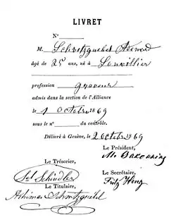 The International Alliance of Socialist Democracy was an organisation founded by Mikhail Bakunin along with 79 other members on 28 October 1868, as an organisation within the International Workingmen's Association (IWA).[1] The establishment of the Alliance as a section of the IWA was not accepted by the general council of the IWA because, according to the IWA statutes, international organisations were not allowed to join because the IWA already fulfilled the role of an international organisation. The Alliance dissolved shortly afterwards and the former members instead joined their respective national sections of the IWA.