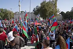 On 1 October, Ali Khamenei's representatives in four provinces (Ardabil, East Azerbaijan, West Azerbaijan and Zanjan) stated that Nagorno-Karabakh belonged to Azerbaijan, that there was a need to return the territory, and that Azerbaijan's government had acted in accordance with the law.[158][62] The next day, several protests erupted in Iranian cities, including the capital Tehran and Tabriz, in support of Azerbaijan. Iranian Azerbaijani demonstrators chanted pro-Azerbaijan slogans.[159] The local security forces intervened, detaining at least 38 people.[160] The same day, around 50 Azerbaijani representatives from the 5,000-strong community in Moldova expressed their support for Azerbaijan in the capital Chișinău.[161] On 3 October, Azerbaijanis in Georgia indicated a readiness to fight for Azerbaijan and the desire that Azerbaijan retake Nagorno-Karabakh.[162] On 16 October, Azerbaijanis, Iranian Azerbaijanis, and Turks living in the United Kingdom gathered in front of Amnesty International's London headquarters and held a protest rally, condemning the shelling of residential areas and civilians in Ganja, Mingachevir, Tartar, and other regions.[163] The next day, Azerbaijani Americans held a rally in Chicago, condemning the attacks on Ganja.[164] The following day, British Azerbaijanis commemorated those killed during the attacks in front of the Azerbaijani embassy in London.[165] while Georgian Azerbaijanis held a rally in front the Parliament Building in Tbilisi.[166] On the same day, Russian Azerbaijanis dedicated part of the entrance door of Azerbaijan's embassy to Russia in Moscow to the memory of the victims of the 17 October attack.[167] Protests erupted in Tabriz, with many Iranian Azerbaijanis chanting pro-Azerbaijani slogans and protesting Iran's alleged arms support to Armenia via the Nordooz border crossing.[168] Iranian security forces intervened, detaining over 200 people.[169] On 23 October, American Azerbaijanis gathered in a pro-Trump rally and voiced their support for Azerbaijan,[170] while in San Francisco and Minnesota, Azerbaijanis rallied and condemned Armenia for "the ballistic missile attacks" on cities.[171][172][173] On 26 October, Azerbaijanis organized rallies in Bielefeld, Germany, and Copenhagen, Denmark.[174][175]