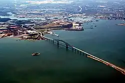 The Outer Harbor Crossing is the name given to the segment of the Baltimore Beltway maintained by the MDTA.[11] It consists of the segment of I-695 between exit 40 (MD 151) and exit 2 (MD 10), which included the Francis Scott Key Bridge.[1][2] The route was originally planned as a two-lane freeway on a four-lane right-of-way, with a two-lane outer harbor tunnel across the Patapsco River. When the tunnel was advertised for construction in 1970, the bids were so high that the decision was made to construct a four-lane bridge instead.[11] The bridge was to feature two-lane approach roads on both sides.[24]